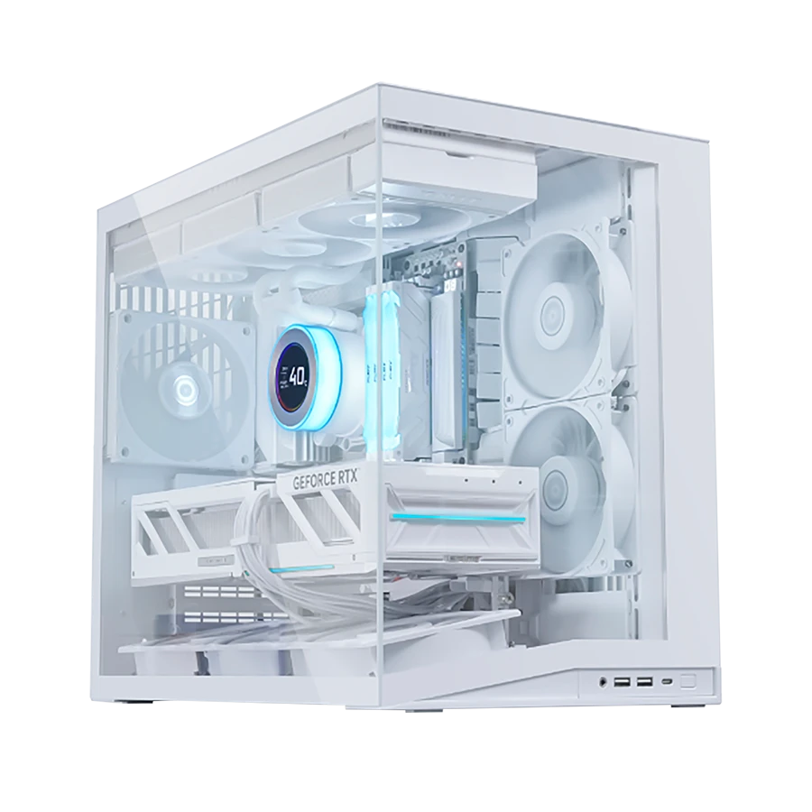 کیس گیمینگ لیان لی Lian Li O11D MINI V2 Flow White با طراحی مدرن و شیشه‌ای خود، جلوه‌ای حرفه‌ای و چشم‌نواز به سیستم شما می‌بخشد. این کیس از شیشه سکوریت بدون ستون در بخش جلو و کناره‌ها بهره می‌برد. ابعاد دقیق 45.38 لیتر این شاسی به گونه‌ای بهینه شده تا فضای داخلی گسترده‌ای با حداقل اشغال فضا ارائه دهد. استفاده از پنل‌های آلومینیومی و شیشه‌ای باعث افزایش مقاومت و زیبایی ساختاری شده و در عین حال ظاهر سیستم را بسیار تمیز و حرفه‌ای نمایش می‌دهد.
