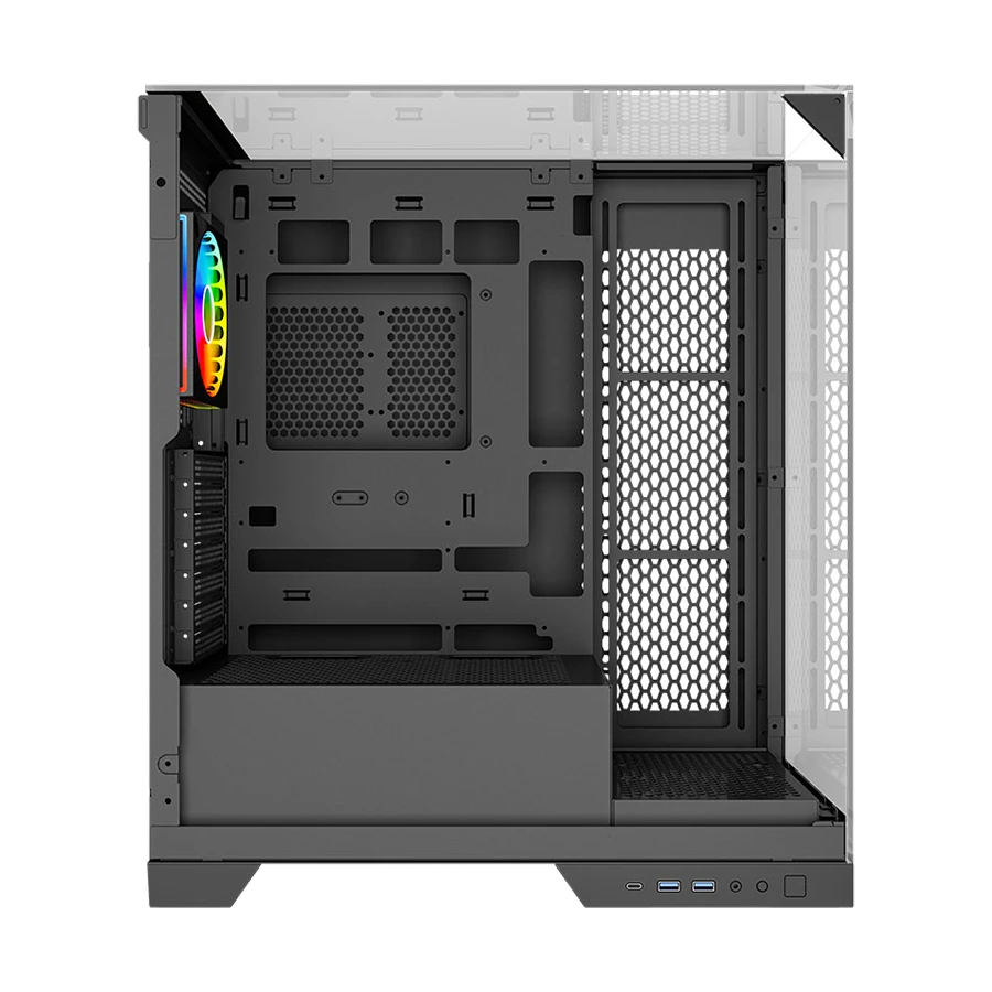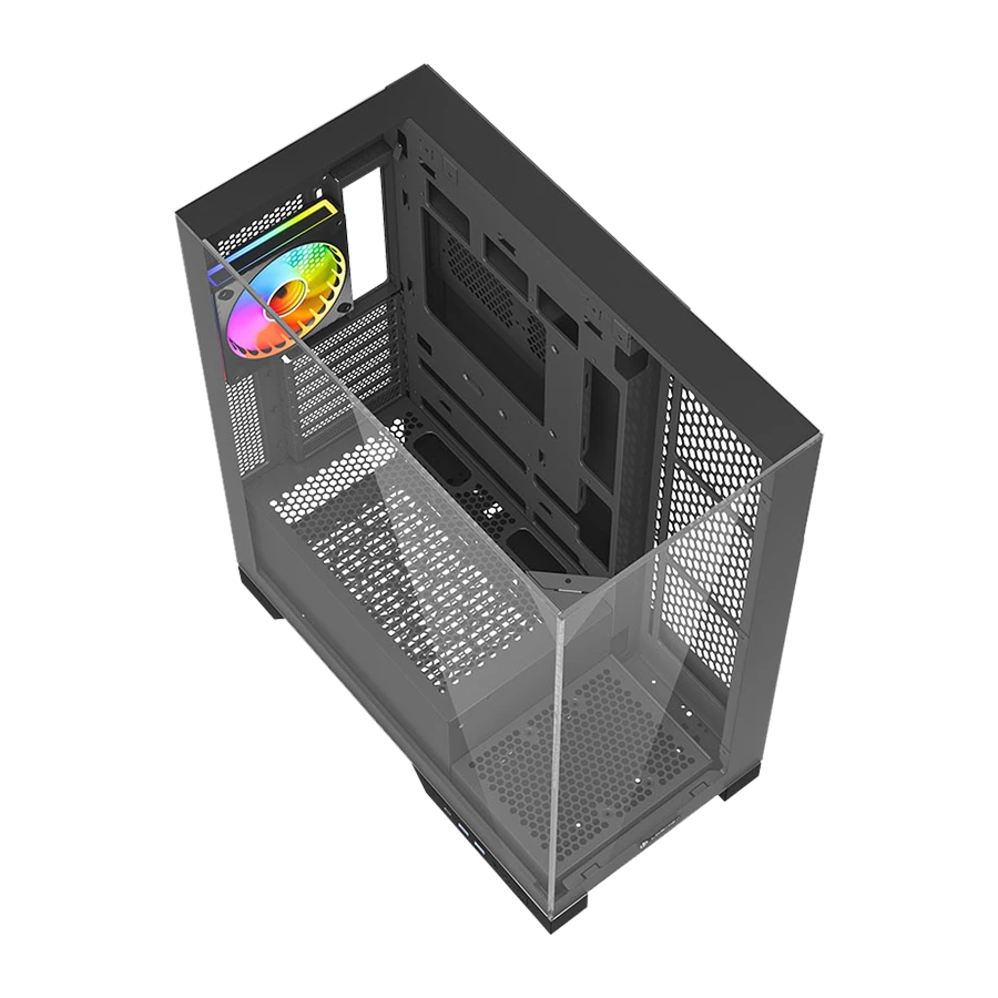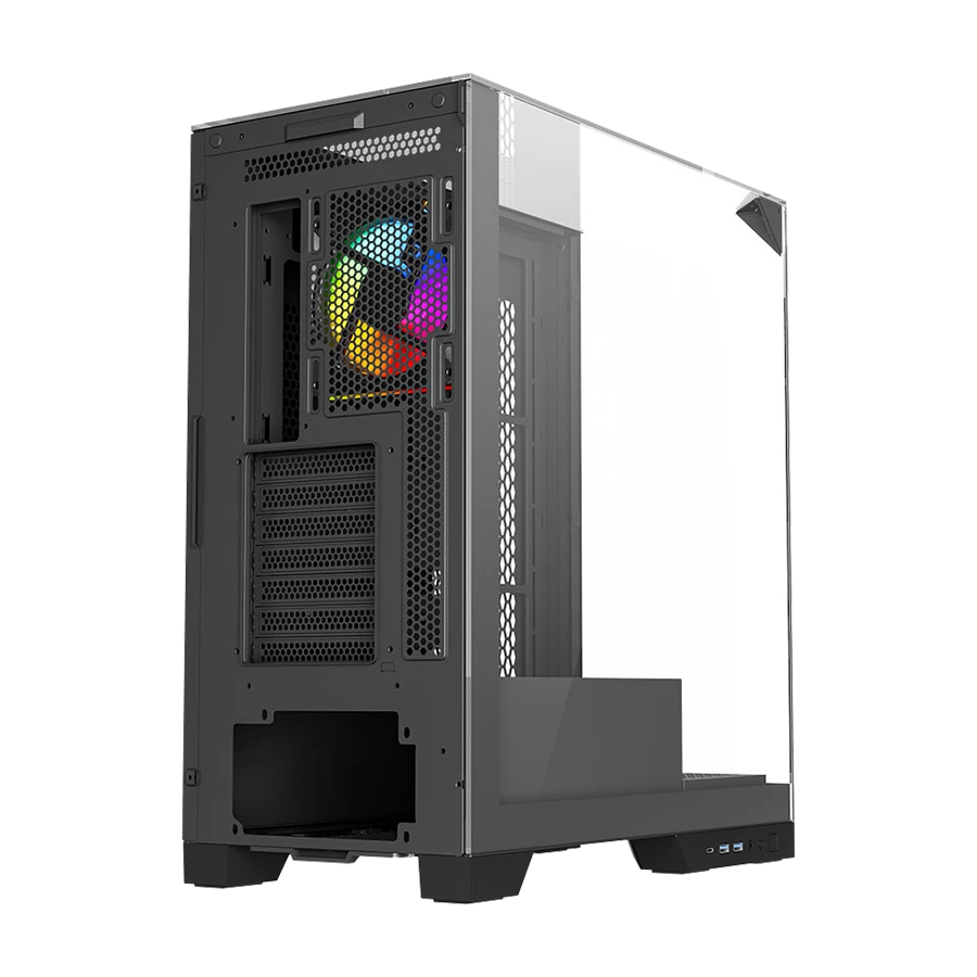 در این کیس از پنل جلویی و کناری شیشه حرارت‌دیده برای نمایش قطعات داخلی استفاده شده است. پنل کناری کشویی امکان دسترسی سریع و ایمن به فضای داخلی کیس را برای کاربران فراهم می‌کند. با رنگ مشکی یکدست، جلوه‌ای حرفه‌ای و هماهنگ با تجهیزات گیمینگ ایجاد می‌کند و طراحی ساده و شفاف این کیس، نورپردازی قطعات را به شکلی بسیار جذاب نمایش می‌دهد.