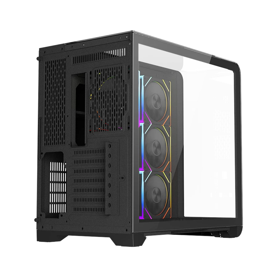 پنل جلویی کیس به نمایشگر LCD و سنسور دمای CPU مجهز شده که اطلاعات کاربردی ارائه می‌دهد. پورت‌های Type-C، دو USB 3.0 و خروجی صدا و میکروفن، دسترسی سریع و کاملی فراهم می‌کنند. فیلترهای گردوغبار در بخش بالا و پایین کیس، از ورود آلودگی به قطعات جلوگیری می‌نمایند. فضای مدیریت کابل با طراحی مناسب، اسمبل تمیز و جریان هوای بهتر را تضمین می‌کند.
