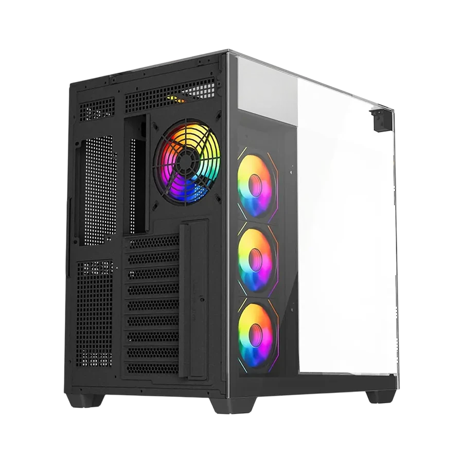 کیس گیمینگ لاجیکی Logikey C714B با رنگ مشکی مات، ظاهری حرفه‌ای، مدرن و هماهنگ با سیستم‌های گیمینگ امروزی ارائه می‌دهد. استفاده از پنل شیشه‌ای حرارت‌دیده کشویی در سمت چپ، جلوه‌ای شفاف برای نمایش قطعات داخلی فراهم می‌کند. پنل سمت راست از فولاد مقاوم ساخته شده و استحکام کلی بدنه را در استفاده طولانی‌مدت تضمین می‌کند.