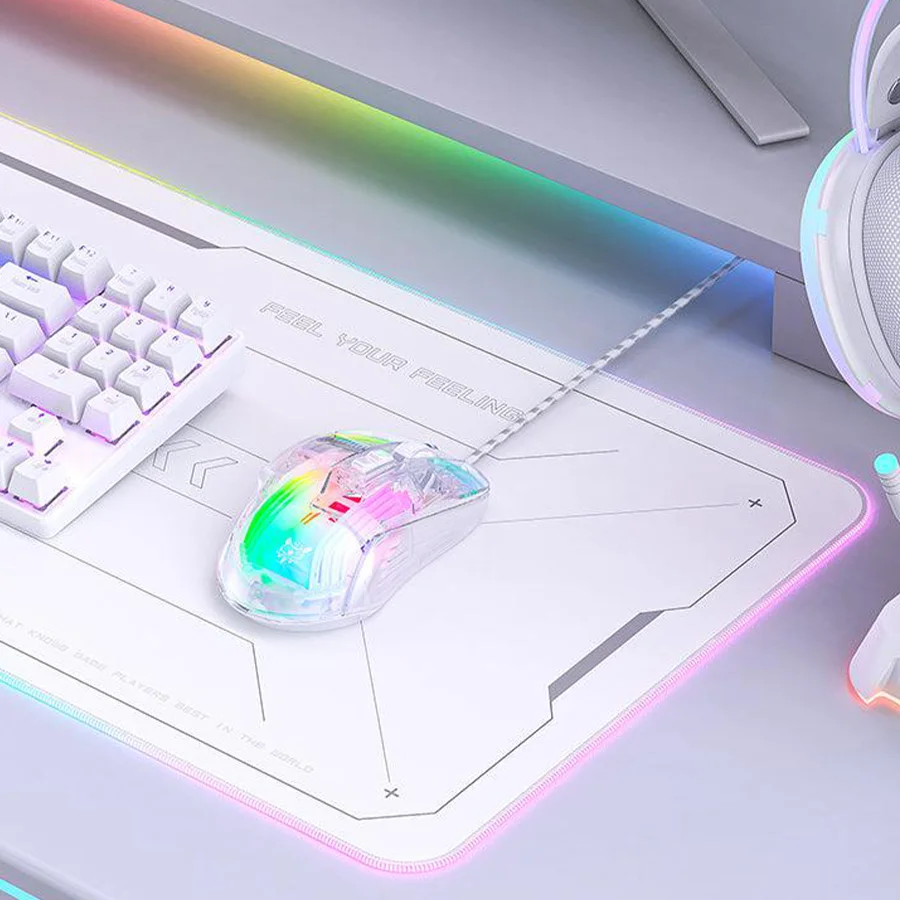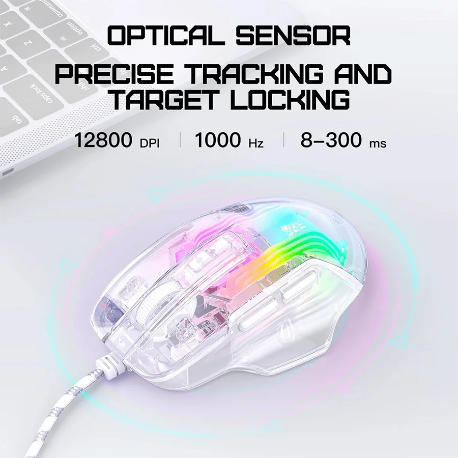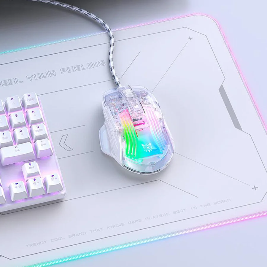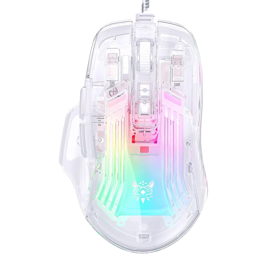 ماوس گیمینگ اونیکوما ONIKUMA CW923 با طراحی مکانیکی شفاف و خاص، ظاهری خلاقانه و مدرن به ستاپ گیمینگ شما می‌بخشد. پوسته شفاف این موس، جلوه‌ای متفاوت و چشم‌نواز ایجاد کرده و با نورپردازی RGB، فضایی حرفه‌ای و جذاب برای بازی فراهم می‌آورد. این طراحی منحصر‌به‌فرد نه تنها زیبایی بصری دارد بلکه به‌خوبی با سایر تجهیزات گیمینگ هماهنگ می‌شود.