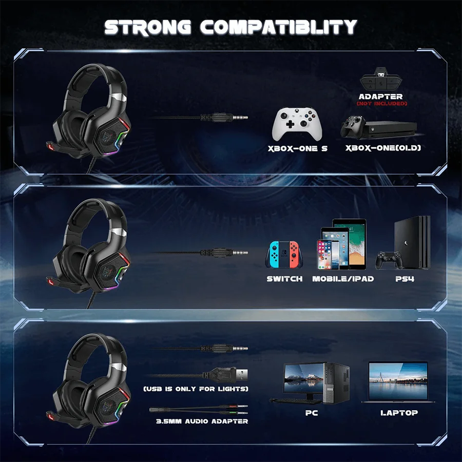 نورپردازی RGB هدست Onikuma K10 Pro Black تجربه گیمینگ شما را جذابتر میکند. این نورپردازی با ولتاژ کاری 5 ولت جلوهای زیبا به محیط بازی میبخشد. کابل 2.2 متری هدست آزادی حرکت بیشتری را فراهم میکند.