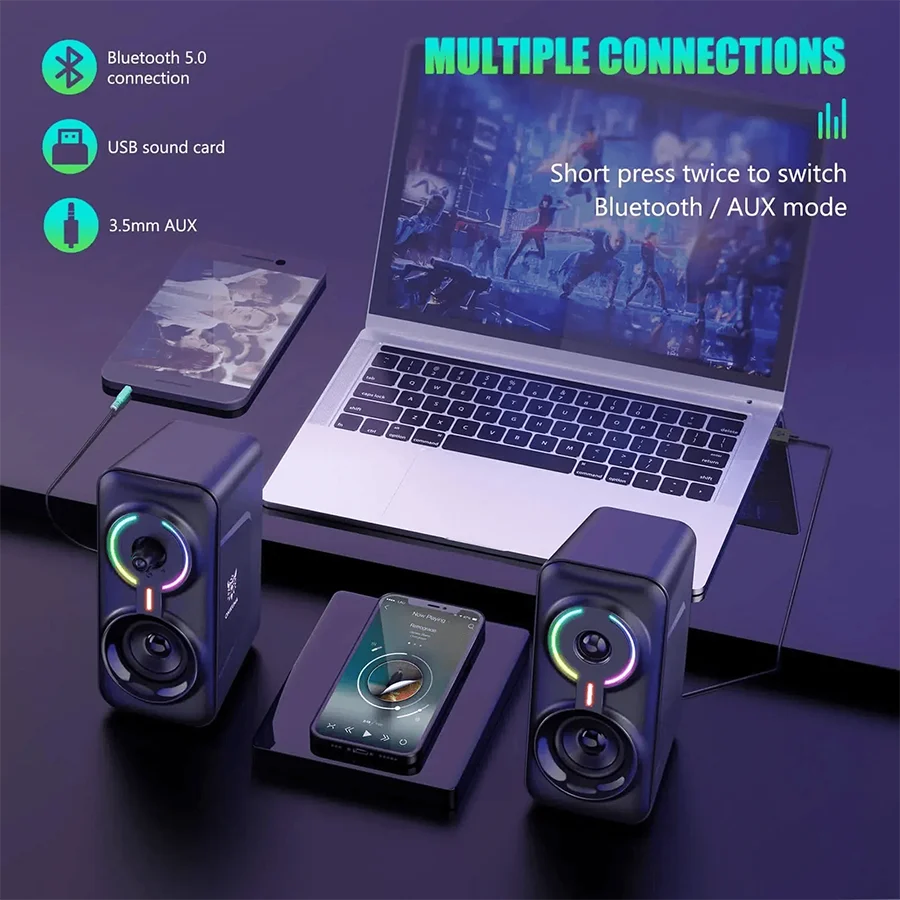 این اسپیکر با بلوتوث 5.0 و اتصال USB به راحتی به دستگاه‌های مختلف مانند کامپیوتر، موبایل و تبلت متصل می‌شود. همچنین با جک 3.5 میلی‌متری، می‌توانید آن را به دستگاه‌های قدیمی‌تر هم متصل کنید. این ویژگی‌ها آزادی عمل زیادی را برای اتصال فراهم می‌آورد.