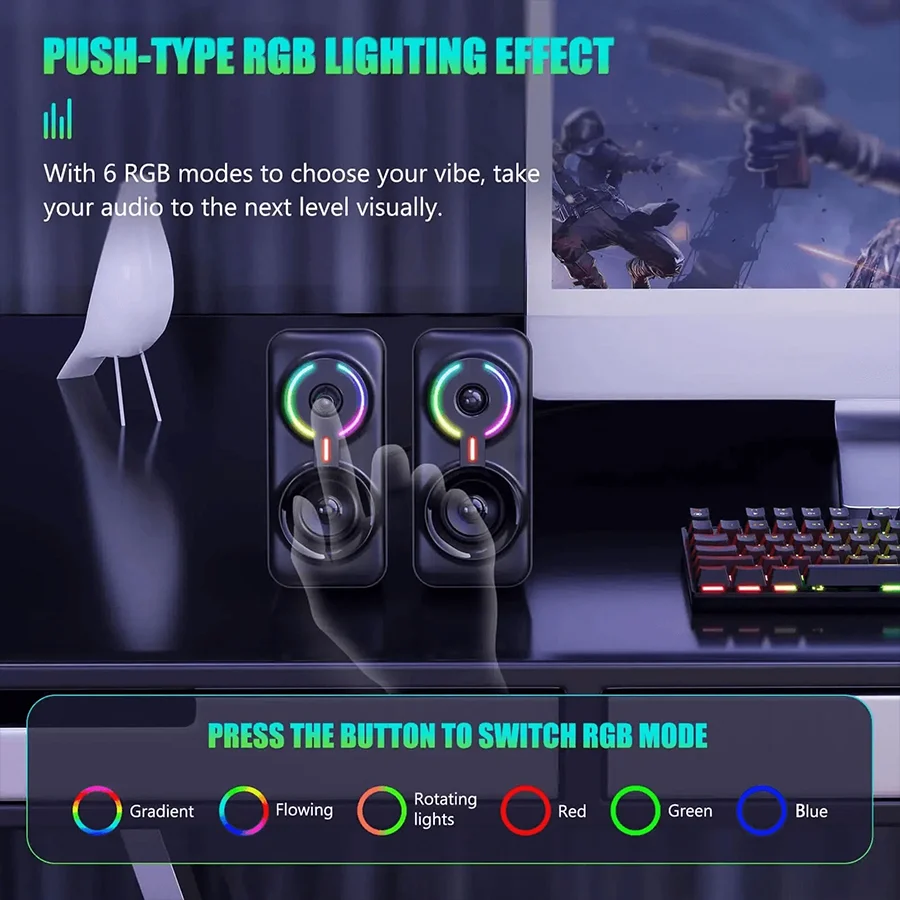 این اسپیکر از پنج حالت نورپردازی RGB پشتیبانی می‌کند که می‌توانید به راحتی آن‌ها را تغییر دهید. انتخاب سبک نورپردازی متناسب با محیط بازی یا فیلم شما، تجربه‌ای جذاب‌تر را ایجاد می‌کند. همچنین، شما می‌توانید نورپردازی را به دلخواه خاموش کنید.