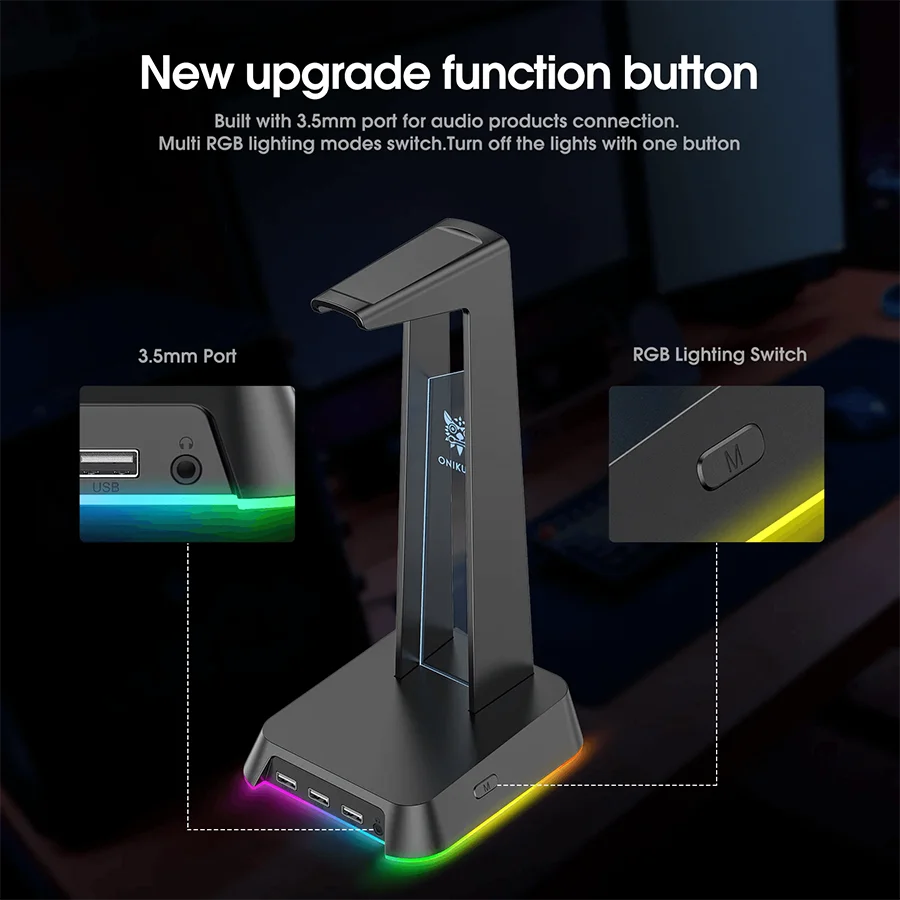 پایه نگهدارنده ONIKUMA ST-2 علاوه بر طراحی زیبا، به امکانات کاربردی متعددی نیز مجهز است. این پایه دارای سه پورت USB و یک جک 3.5 میلیمتری صدا است که به شما امکان اتصال راحت دستگاههای مختلف از جمله هدفون، فلش مموری، و دیگر لوازم جانبی را میدهد. با ورودی برق 5 ولت و جریان مصرفی کمتر از 250 میلیآمپر، این پایه مصرف انرژی کمی دارد و برای استفاده روزمره بسیار مناسب است. طول کابل 1.5 متری آن به شما آزادی عمل بیشتری برای تنظیم مکان قرارگیری پایه میدهد.