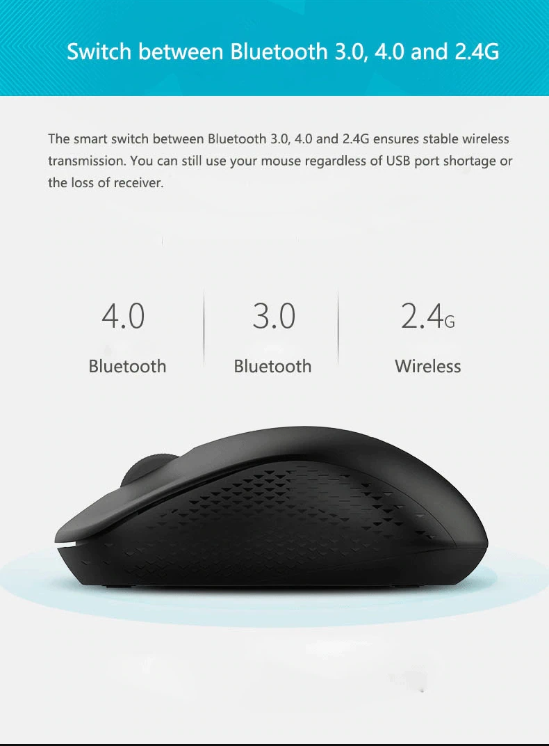 جابجایی هوشمند بین بلوتوث ۳، ۴ و وای فای ۲.۴ گیگاهرتزی ، یک اتصال بیسیم مطمئن را برقرار میکند که ۳۶۰ درجه را پوشش میدهد. شما بدون اینکه نگران اشغال پورت یو اس بی خود باشید یا اینکه، گیرنده سیگنال بلوتوث یا وای فای شما دچار اختلال شود میتوانید با این موس به سیستم خود متصل شوید.