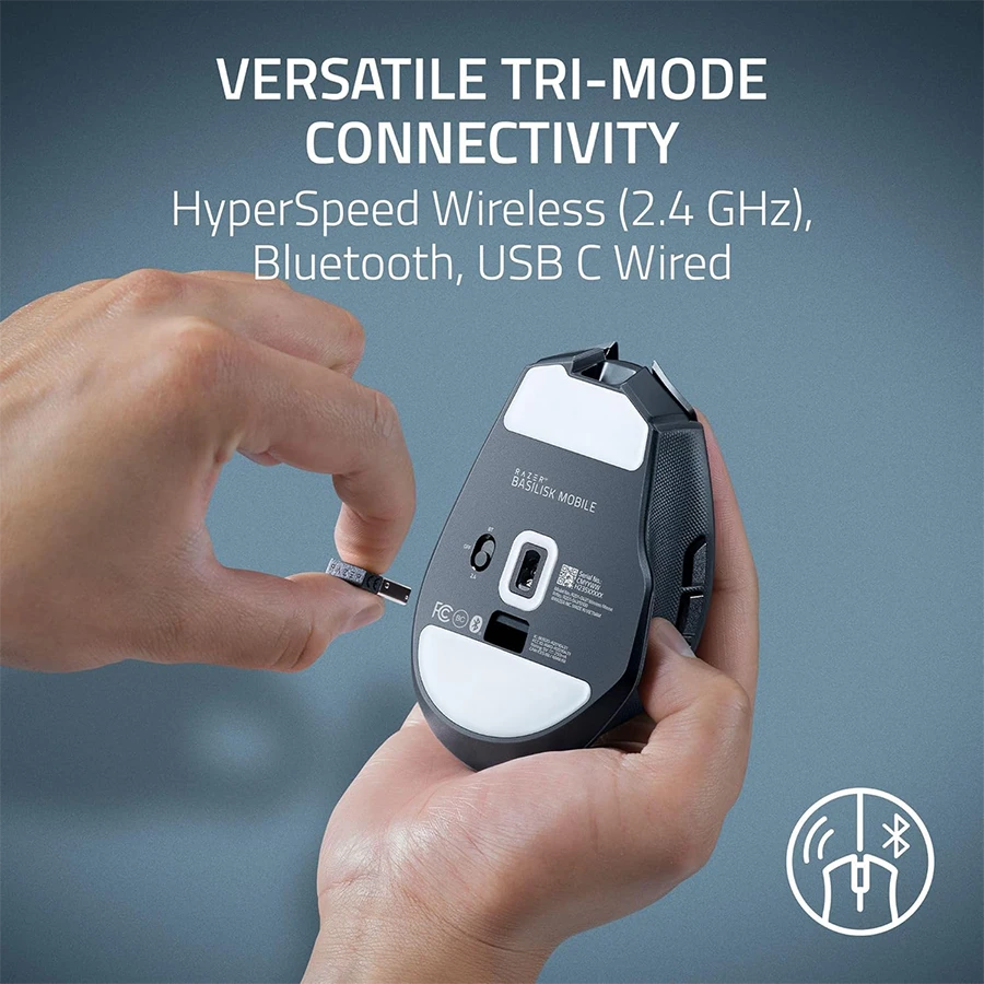 موس BASILISK MOBILE از اتصال سه‌حالته شامل HyperSpeed Wireless، بلوتوث و اتصال سیمی پشتیبانی می‌کند. اتصال بی‌سیم HyperSpeed تأخیر بسیار کمی دارد و برای بازی حرفه‌ای مناسب است. در حالت بلوتوث، عمر باتری تا 180 ساعت افزایش می‌یابد و بهره‌وری بیشتری ایجاد می‌کند. باتری در حالت HyperSpeed تا 105 ساعت دوام دارد. کابل USB-C همراه، امکان شارژ و استفاده هم‌زمان را فراهم می‌کند.