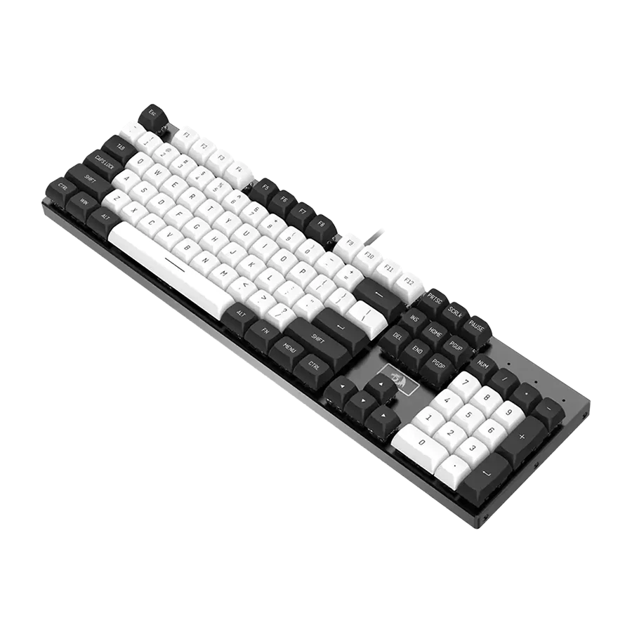 ترکیب رنگ مشکی و سفید در کی کپ های Redragon A132 CSA PBT ظاهری مدرن و مینیمال ایجاد میکند. این طراحی بهراحتی با انواع ستاپهای گیمینگ و کاری هماهنگ میشود. نبود حروف فارسی باعث میشود ظاهر کلیدها ساده و یکدست باقی بماند. این موضوع برای کاربرانی که به طراحی تمیز اهمیت میدهند، یک مزیت محسوب میشود. سطح مات کلیدها نیز از بازتاب نور جلوگیری میکند و تمرکز کاربر را افزایش میدهد.