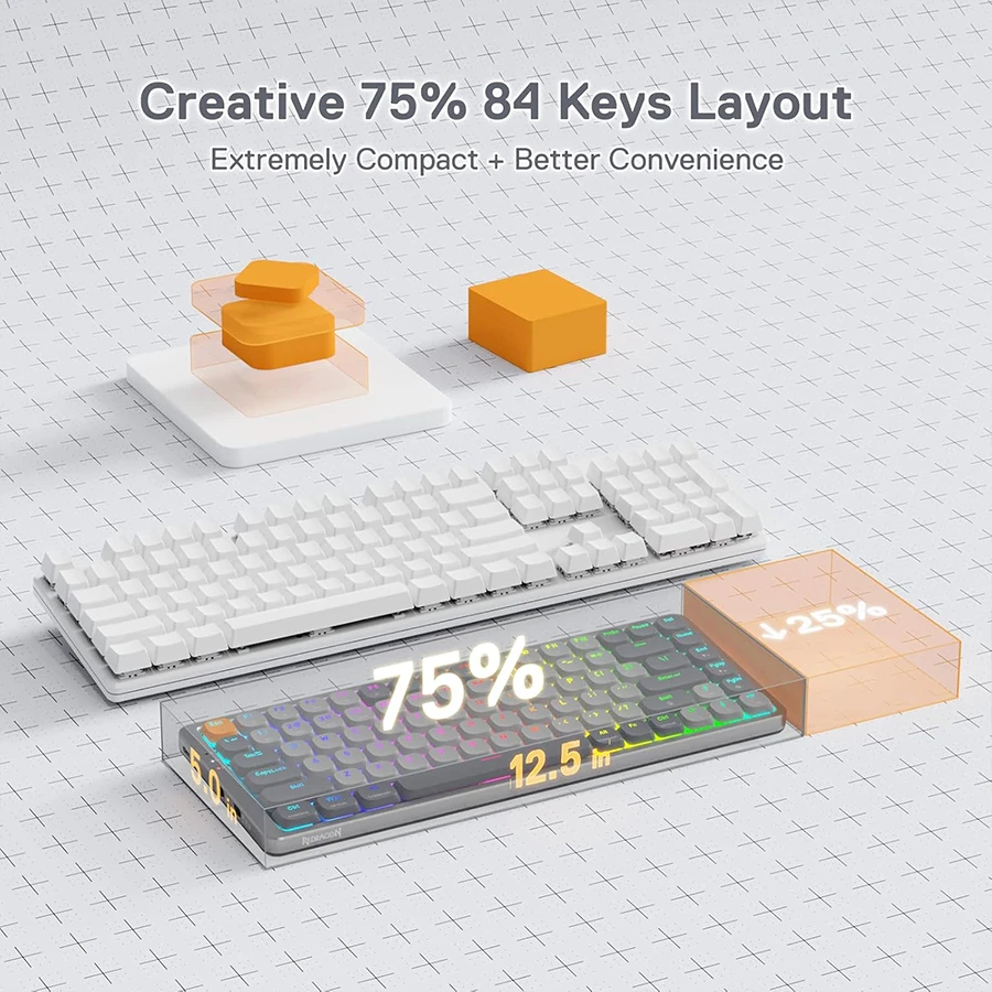 Redragon K652 PRO دارای طراحی ۷۵٪ است که علاوه بر کاهش ابعاد، فضای بیشتری برای حرکت ماوس در اختیار گیمرها قرار میدهد. این کیبورد برخلاف مدلهای ۶۵٪، دارای کلیدهای فانکشن و هفت کلید کنترل اضافی است که تجربه کاربری را بهبود میبخشد و کاربرد آن را برای تایپ و بازی بسیار راحتتر میکند.