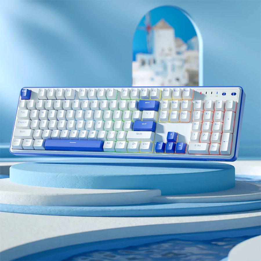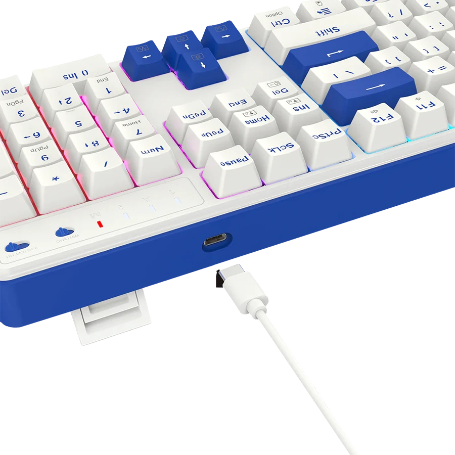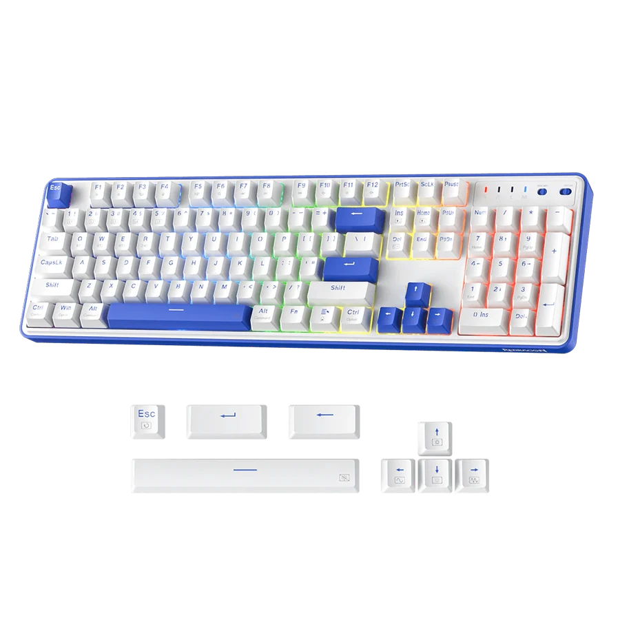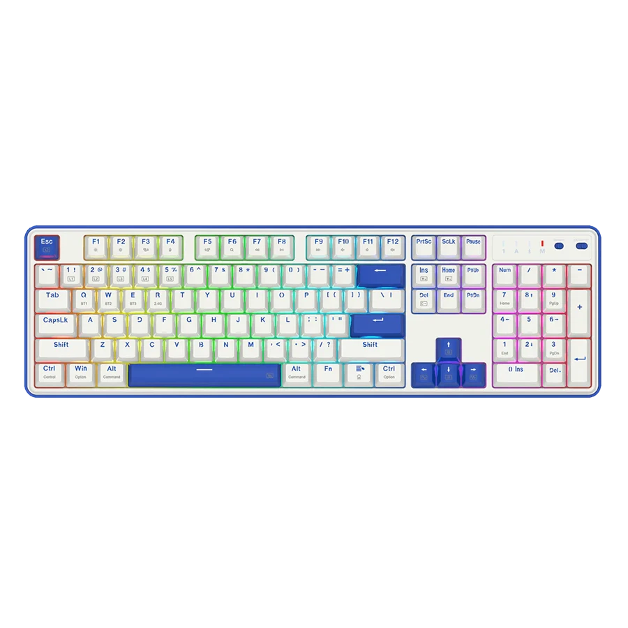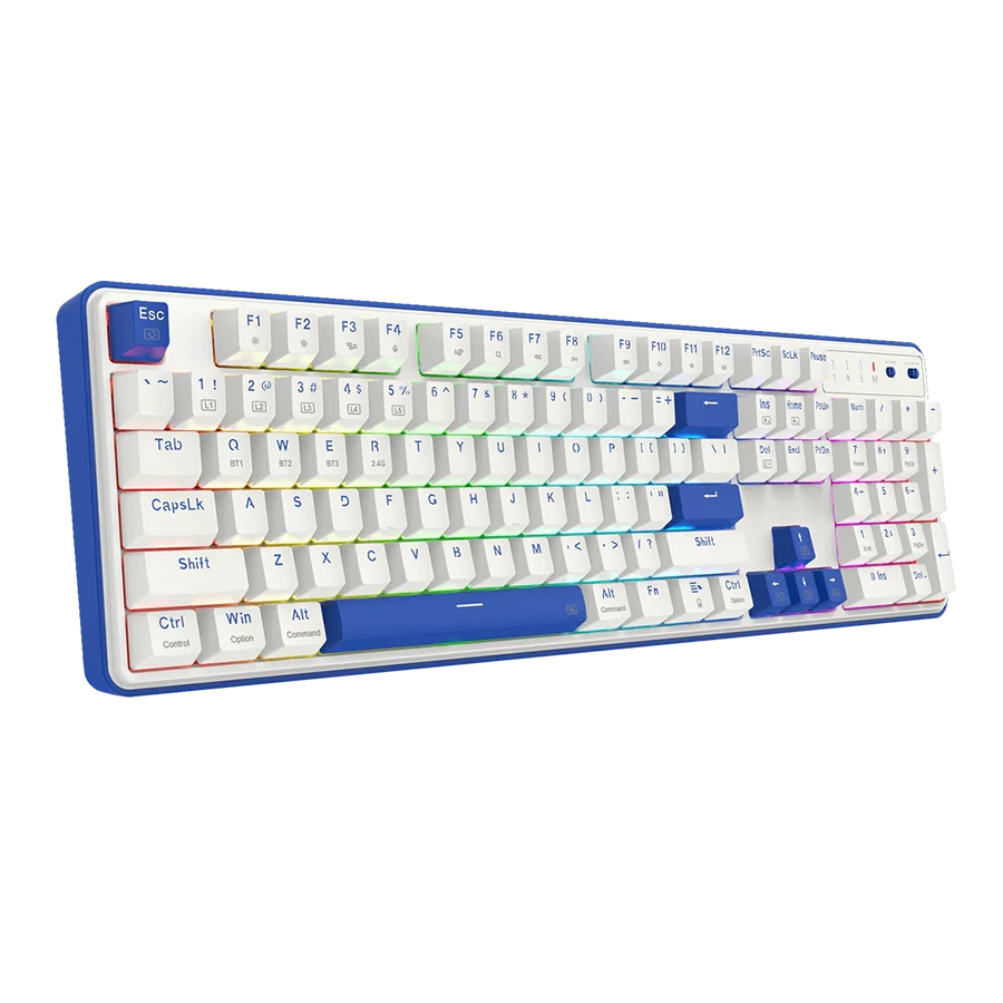 با حفظ چیدمان کامل ۱۰۴ کلید، Redragon K685 PRO در اندازهای ۲۰٪ کوچکتر طراحی شده است تا فضای میز را بهینه کند. رنگ سفید اصلی با ۸ کلید آبی، ظاهری تازه و جذاب ایجاد کرده که در کنار نورپردازی RGB، جلوهای زیبا به میز کار یا گیمینگ شما میبخشد. همچنین، ۸ کلید سفید اضافی نیز همراه کیبورد ارائه میشود تا ظاهر آن را به دلخواه تغییر دهید.