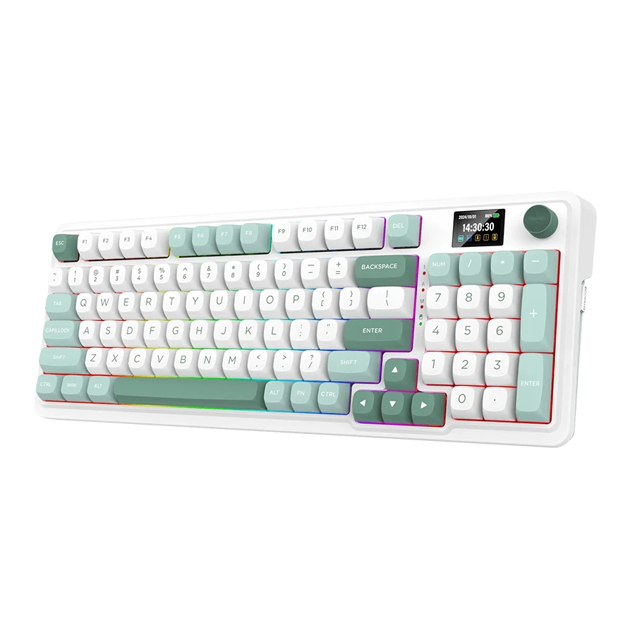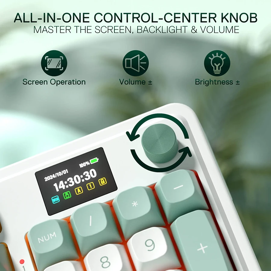 یکی از ویژگیهای برجسته GALATIN PRO K719، صفحه نمایش ۱.۴۱ اینچی TFT است. که اطلاعات مختلفی مانند حالت اتصال، میزان باتری و وضعیت تایپ را نمایش میدهد. این صفحه نمایش حتی امکان شخصیسازی با گیفهای دلخواه را فراهم میکند. تا فضای کاربری شما همیشه با حال و هوایتان همگام باشد. همچنین یک دکمه کنترلی چندمنظوره برای تنظیم روشنایی نورپردازی و کنترل مدیای صوتی به راحتترین شکل ممکن در اختیار شماست.