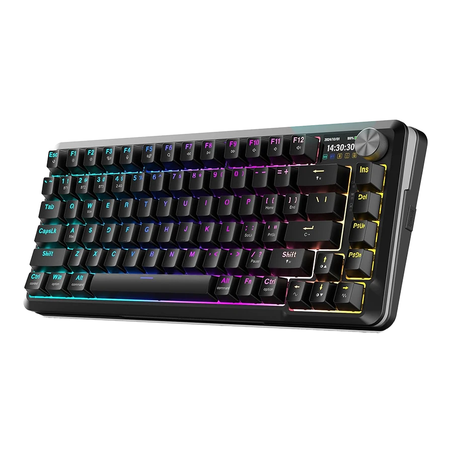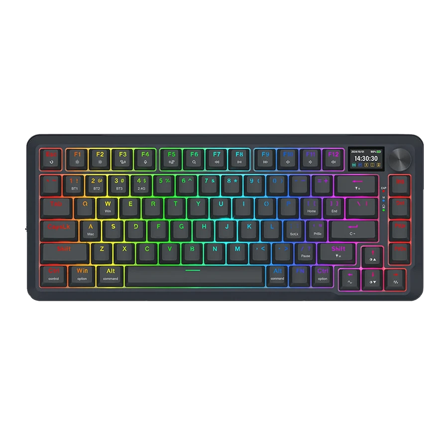 کیبورد بی سیم/باسیم مکانیکال گیمینگ ردراگون K708 PRO RGB با یک نمایشگر ۱.۱۴ اینچی OLED عرضه میشود. که اطلاعاتی چون وضعیت اتصال، افکتهای نورپردازی، تاریخ و زمان، سطح باتری و حتی تصاویر شخصی شما را بهصورت زنده نمایش میدهد. این قابلیت نه تنها ظاهری حرفهای به دستگاه میبخشد، بلکه تجربهی کاربری روان و دقیقی را برای گیمرها و کاربران حرفهای رقم میزند. همچنین وجود یک دکمه چرخشی چندمنظوره در کنار نمایشگر، امکان کنترل آسان صدا، تغییر حالت نورپردازی و تنظیمات نمایشگر را فراهم کرده است.