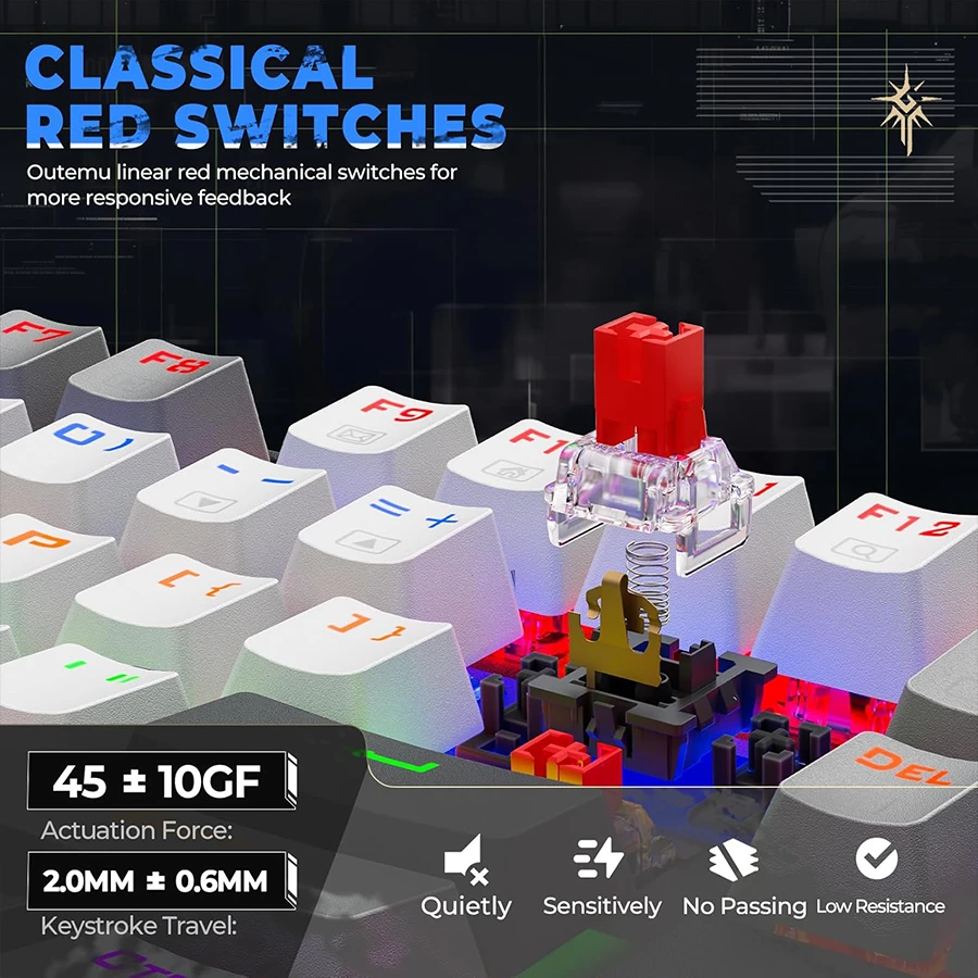 سوئیچ‌های قرمز مکانیکال عملکردی نرم، سریع و خطی برای ثبت دقیق دستورات در بازی ارائه می‌دهند. نبود صدای کلیک اضافی، تمرکز کاربر را در جلسات طولانی بازی یا تایپ افزایش می‌دهد. پاسخ‌دهی سریع کلیدها باعث می‌شود دستورات بدون تأخیر و با دقت بالا اجرا شوند. قابلیت Anti-Ghosting در تمام 87 کلید، ثبت هم‌زمان چند فرمان را تضمین می‌کند.