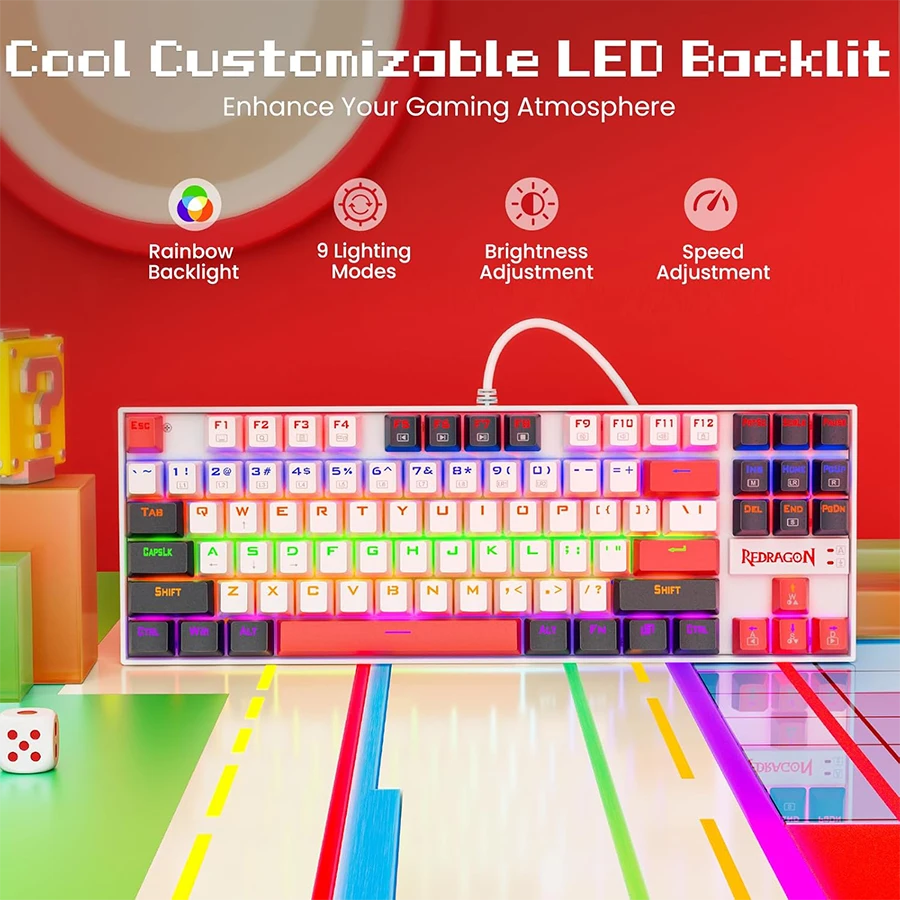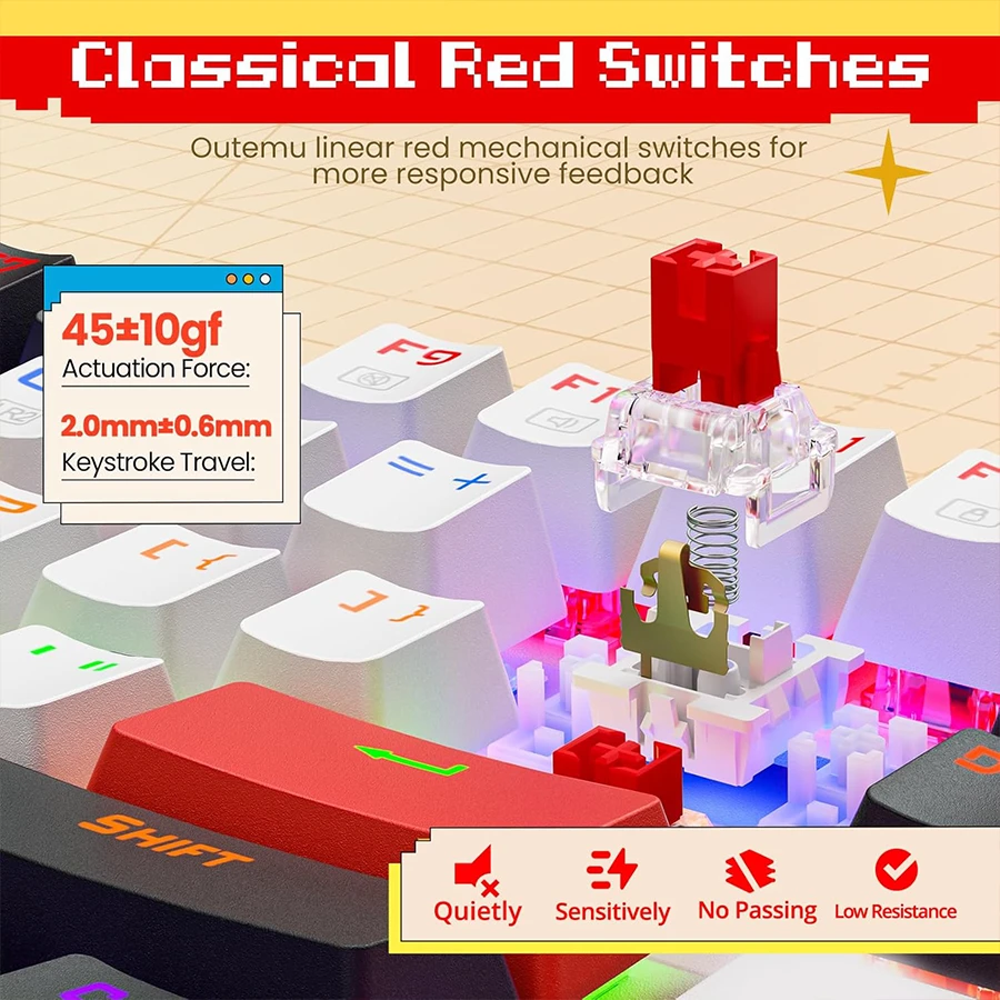 سوئیچهای قرمز مکانیکال عملکردی نرم، سریع و خطی برای ثبت دقیق دستورات در بازی ارائه میدهند. نبود صدای کلیک اضافی، تمرکز کاربر را در جلسات طولانی بازی یا تایپ افزایش میدهد. پاسخدهی سریع کلیدها باعث میشود دستورات بدون تأخیر و با دقت بالا اجرا شوند. قابلیت Anti-Ghosting در تمام 87 کلید، ثبت همزمان چند فرمان را تضمین میکند.