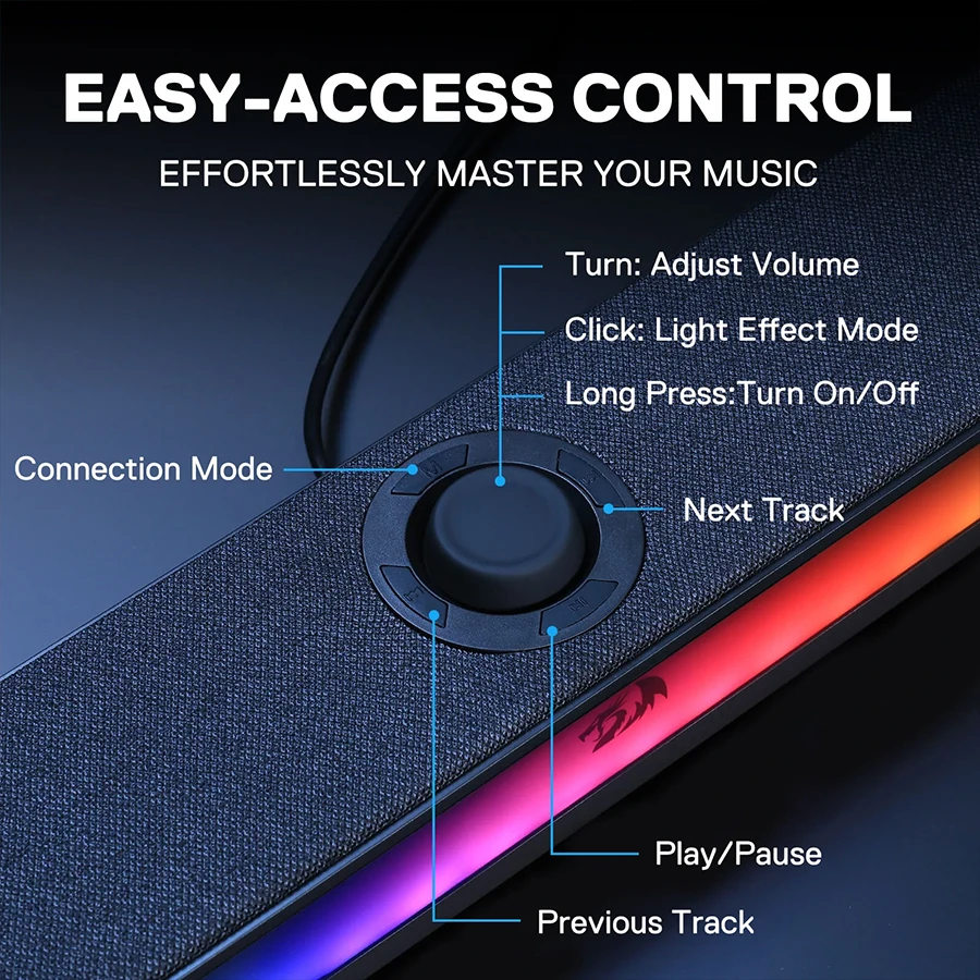 بر روی این اسپیکر یک پیچ کنترل چندکاره تعبیه شده است که به‌راحتی قابل استفاده است. با چرخاندن این پیچ می‌توانید میزان صدا را تنظیم کرده یا حالت اتصال و نورپردازی را تغییر دهید. این طراحی هوشمند به شما امکان می‌دهد تمرکز خود را از بازی یا کار قطع نکنید و همه چیز را در لحظه مدیریت کنید. سادگی و سرعت عمل، از ویژگی‌های برجسته این کنترل پنل است.