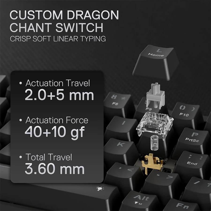 این کیبورد به سوئیچهای سفارشی خطی Dragon Chant مجهز است. که با روغنکاری ضخیم و ترکیب با ساختار گسکت، حس نرمی را در هر فشار کلید به کاربر منتقل میکند. این سوئیچها بدون صدا و با پاسخگویی سریع، برای گیمرهایی که به دقت و سرعت اهمیت میدهند، انتخابی عالی هستند. هر بار تایپ یا فشار کلید، تجربهای لذتبخش، یکدست و بدون اختلال فراهم میسازد.
