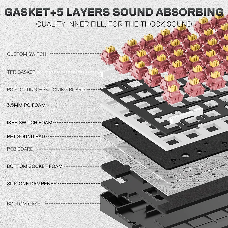 برای داشتن صدایی شفاف و کنترلشده، این کیبورد مجهز به پنج لایه عایق نویز است. استفاده از فومهای مختلف مانند IXPE و سیلیکونی باعث کاهش صدای توخالی و ارتعاشات میشود. نتیجه نهایی یک تجربه تایپ بیصدا و روان است که برای استفاده در دفاتر و محیطهای اشتراکی ایدهآل محسوب میشود. این ویژگی حس حرفهای و آرامش را در هنگام استفاده منتقل میکند.