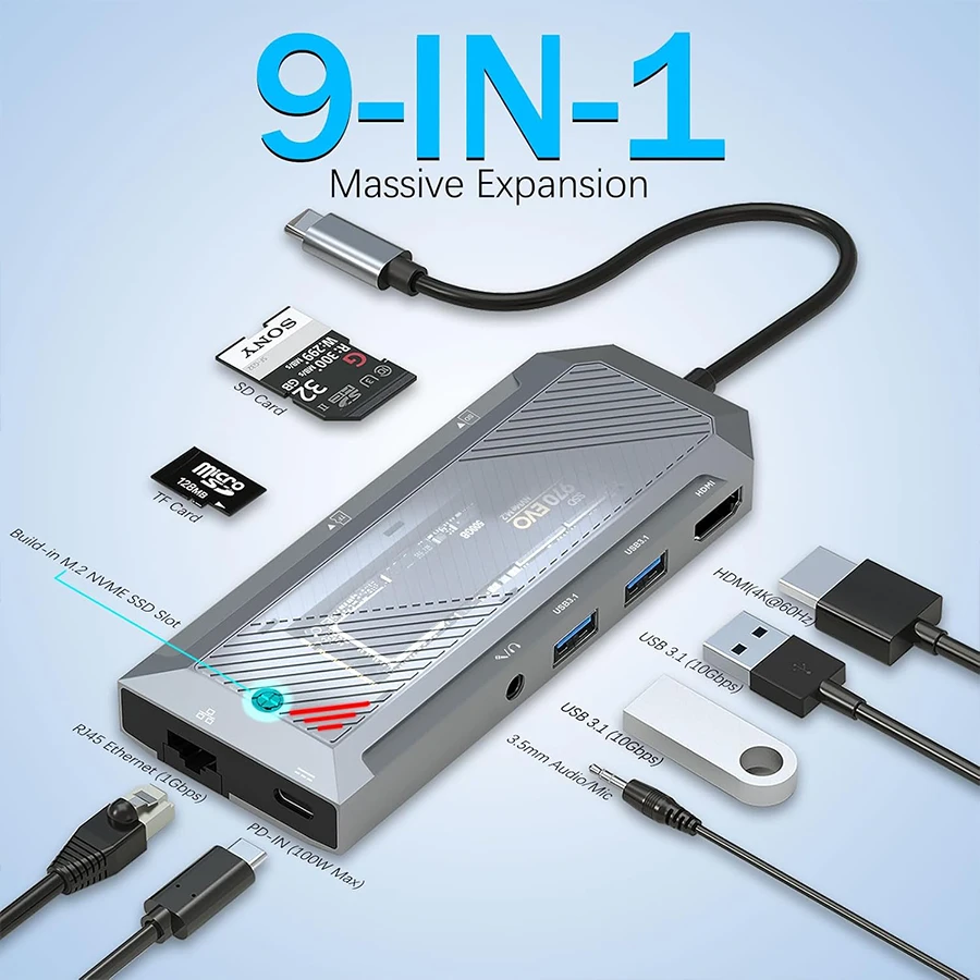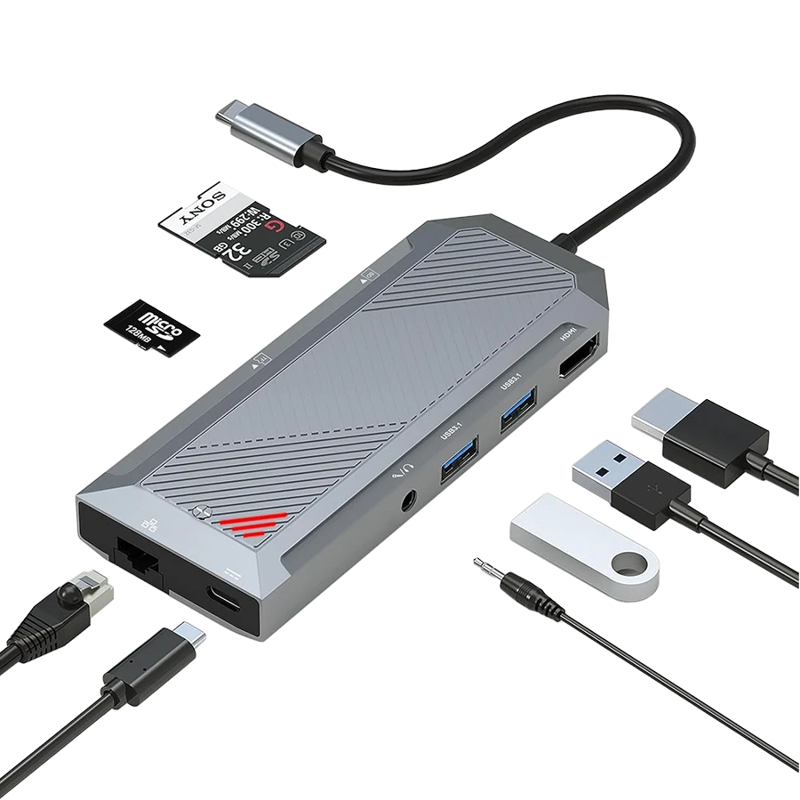 هاب 9 پورت USB ردراگون Redragon UCA-9 یک راهحل همهکاره 9 در 1 برای کاربران حرفهای فراهم میکند. این هاب شامل پورتهای USB 3.1 نوع A و C،همچنین HDMI با پشتیبانی از وضوح 4K@60Hz، اترنت، جک صدا ۳.۵ میلیمتری، کارتخوان SD/TF و جایگاه SSD نوع NVMe است. طراحی فشرده و آلومینیومی آن عملکرد و حمل آسان را بهطور همزمان ممکن میسازد.